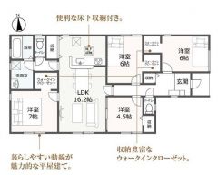 ・大人気の平屋建て。4LDKにWICも付いた間取り。・耐震等級最上の「3」をはじめ、住宅性能評価を取得している安心・安全な家!・スーパーまでは徒歩約9分の立地。