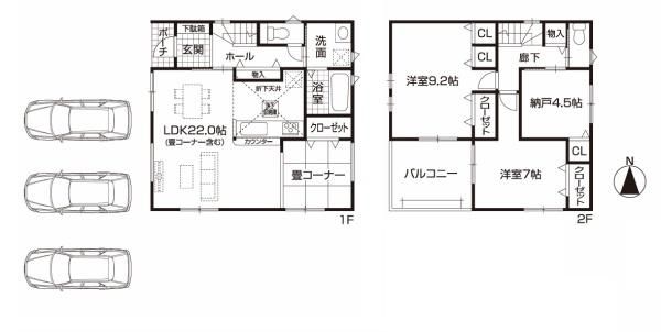 ・敷地は50坪超で陽当たり良好な南庭付、前面道路も広く駐車場も3台分のスペース。 |